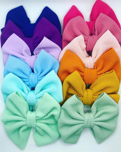 Each bow is available with your choice of finish — a soft, stretchable nylon headband or a secure alligator clip.